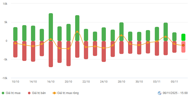 Biến động của dòng tiền từ khối ngoại: Khối ngoại tiếp tục bán ròng trong phiên giao dịch ngày 06/11/2025. Nếu nhà đầu tư nước ngoài duy trì hành động này trong những phiên tới thì tình trạng rung lắc sẽ còn tiếp diễn.