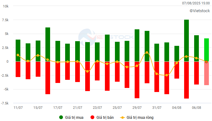 Biến động của dòng tiền từ khối ngoại: Khối ngoại quay lại bán ròng trong phiên giao dịch ngày 07/08/2025. Nếu nhà đầu tư nước ngoài duy trì hành động này trong những phiên tới thì tình hình sẽ trở nên bi quan hơn.