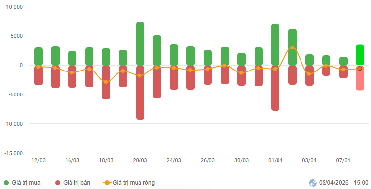 Biến động của dòng tiền từ khối ngoại: Khối ngoại bán ròng trong phiên giao dịch ngày 08/04/2026. Nếu nhà đầu tư nước ngoài duy trì hành động này trong những phiên tới thì trạng thái rung lắc có thể còn tiếp diễn.