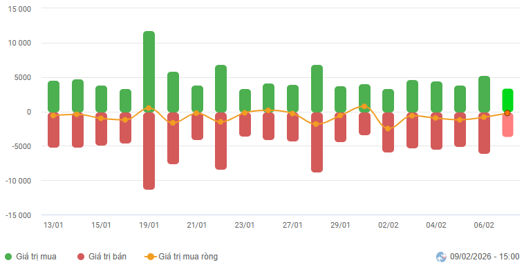 Biến động của dòng tiền từ khối ngoại: Khối ngoại bán ròng trong phiên giao dịch ngày 09/02/2026. Nếu nhà đầu tư nước ngoài duy trì hành động này trong những phiên tới thì tình hình sẽ càng bi quan hơn.