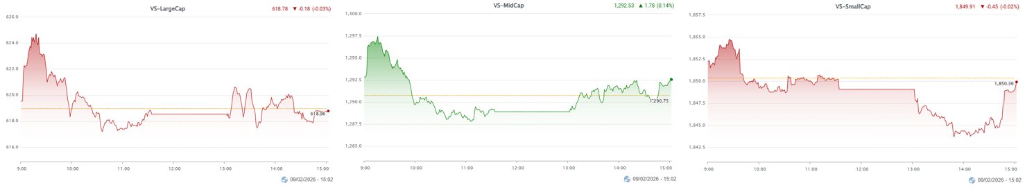 - Diễn biến ở từng nhóm vốn hóa riêng lẻ cũng không có nhiều khác biệt so với chỉ số chung khi các chỉ số chủ yếu dao động trong biên độ hẹp. VS-MidCap khoác sắc xanh nhẹ nhờ lực cầu có phần lần lướt trong khi VS-LargeCap và VS-SmallCap đóng cửa ngay dưới mốc tham chiếu.