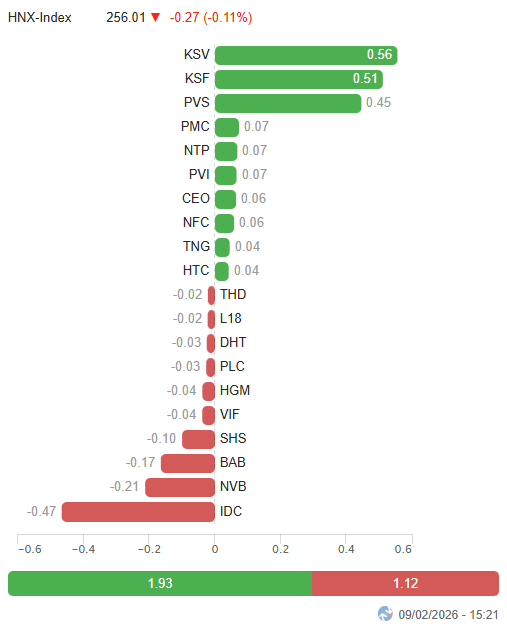 - Các chỉ số chính dừng dưới mốc tham chiếu trong phiên giao dịch ngày 09/02. VN-Index giảm 0.04%, dừng ở mức 1,754.82 điểm; HNX-Index giảm 0.11%, lùi xuống 256.01 điểm.