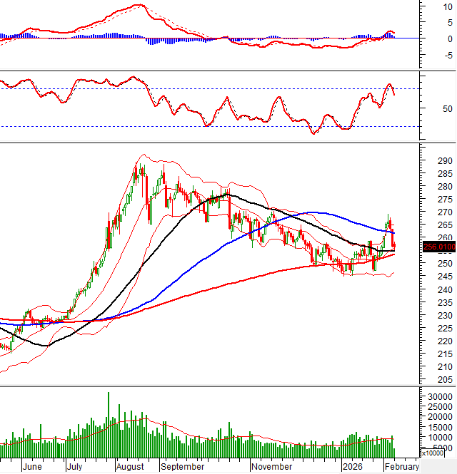 HNX-Index tiếp tục điều chỉnh và đang test lại đường Middle của Bollinger Bands. Đây là ngưỡng hỗ trợ mà chỉ số cần giữ vững để lấy lại triển vọng phục hồi trong ngắn hạn.
