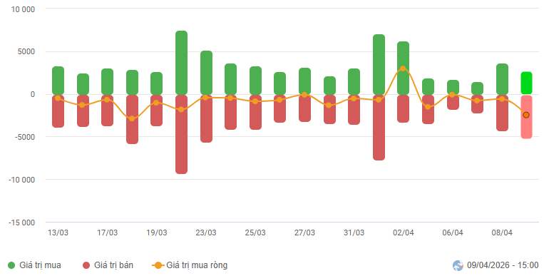 Biến động của dòng tiền từ khối ngoại: Khối ngoại bán ròng trong phiên giao dịch ngày 09/04/2026. Nếu nhà đầu tư nước ngoài duy trì hành động này trong những phiên tới thì trạng thái rung lắc có thể còn tiếp diễn.