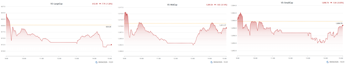 - Áp lực điều chỉnh tập trung chủ yếu ở nhóm vốn hóa lớn khi VS-LargeCap giảm 1.26%, cho thấy vai trò dẫn dắt của các cổ phiếu trụ chưa được bền vững. Trong khi đó, nhóm cổ phiếu vừa và nhỏ diễn biến phân hóa hơn giúp VS-MidCap và VS-SmallCap chỉ giảm nhẹ.