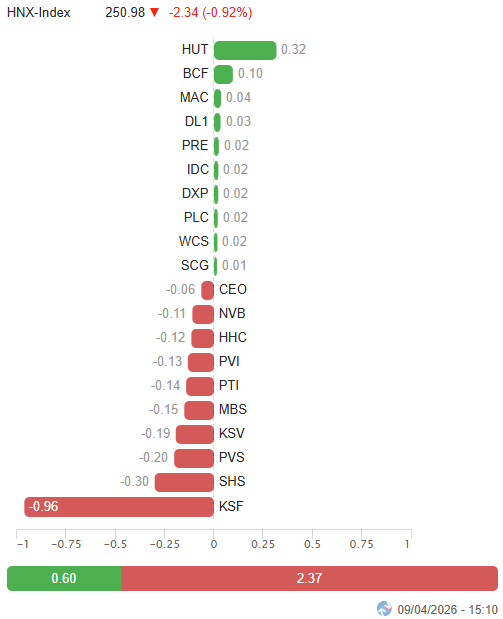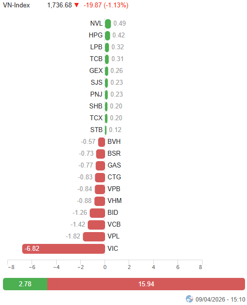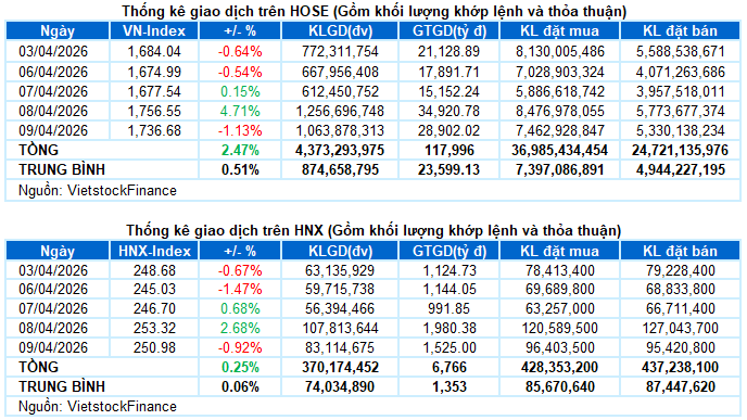 - Các chỉ số chính quay đầu giảm điểm trong phiên giao dịch ngày 09/04. VN-Index giảm 1.13%, xuống còn 1,736.68 điểm. HNX-Index giảm 0.92%, dừng tại 250.98 điểm.