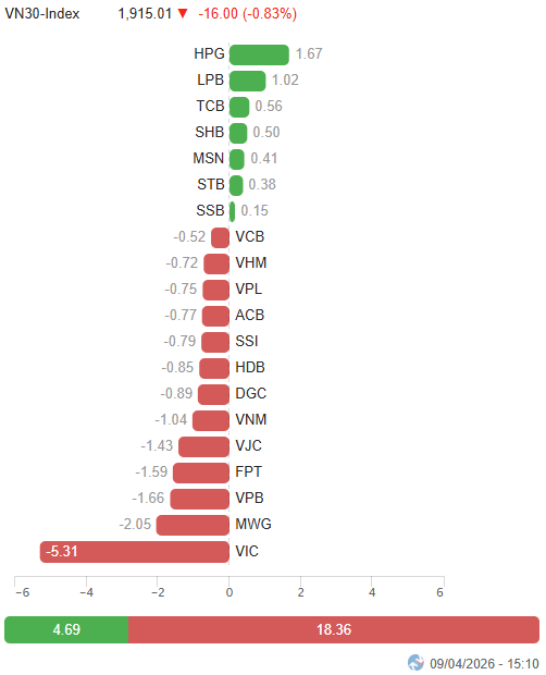 - VN30-Index giảm 16 điểm (-0.83%), xuống còn 1,915.01 điểm. Phe bán chiếm thế áp đảo với 22 mã giảm, 7 mã tăng và 1 mã đứng giá. VPLDGC xếp cuối bảng với mức giảm lần lượt 5.9% và 4.7%, theo sau là VIC, PLX, SSI, VJCBID cũng đồng loạt giảm trên 2%. Ở chiều ngược lại, SHBLPB là hai điểm sáng với mức tăng hơn 1%, trong khi các mã còn lại chỉ nhích nhẹ.
