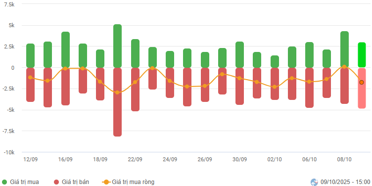 Biến động của dòng tiền từ khối ngoại: Khối ngoại bán ròng trong phiên giao dịch ngày 09/10/2025. Nếu nhà đầu tư nước ngoài duy trì hành động này trong những phiên tới thì tình hình sẽ trở nên bi quan hơn.