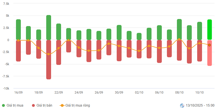 Biến động của dòng tiền từ khối ngoại: Khối ngoại tiếp tục bán ròng trong phiên giao dịch ngày 13/10/2025. Nếu nhà đầu tư nước ngoài duy trì hành động này trong những phiên tới thì tình trạng rung lắc có thể xuất hiện.