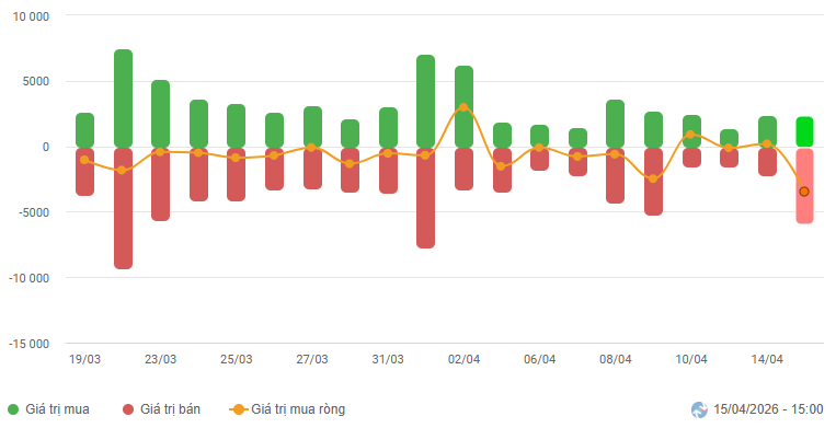 Khối ngoại bán ròng trong phiên giao dịch ngày 15/04/2026. Nếu nhà đầu tư nước ngoài duy trì hành động này trong những phiên tới thì áp lực điều chỉnh có thể gia tăng.
