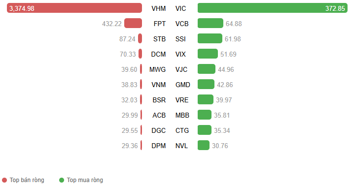 - VN30-Index tăng 15.05 điểm (+0.77%), lên mức 1,961.6 điểm. Tuy nhiên, độ rộng rổ lại nghiêng về bên bán với 17 mã giảm, 11 mã tăng và 2 mã đứng giá. Trong đó, DGC, STB và MWG là những mã chịu áp lực nhiều nhất với mức giảm khoảng 2-3%. Ngược lại, VIC tỏa sáng với sắc tím nổi bật, cùng VJC, VHM, VPL và VRE cũng đồng loạt tăng trên 5%.