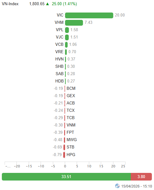 - Thị trường tiếp tục đi lên trong phiên giao dịch 15/04 nhưng động lực tăng điểm chỉ chủ yếu đến từ một vài trụ lớn. VN-Index neo cao quanh ngưỡng 1,790 điểm trong suốt phiên sáng dù diễn biến phân hóa vẫn chi phối rõ nét ở các nhóm ngành. Sang phiên chiều, lực kéo gia tăng từ nhóm cổ phiếu Vingroup giúp chỉ số mở rộng đà tăng và chinh phục mốc 1,800 điểm. Tuy nhiên, điểm đáng chú ý là độ rộng thị trường lại ngày càng trở nên tiêu cực về cuối phiên, cho thấy phần lớn cổ phiếu không đồng thuận với đà tăng của chỉ số. Kết phiên, VN-Index dừng tại 1,800.65 điểm, tăng 25 điểm so với phiên trước.