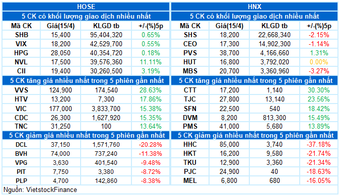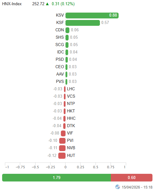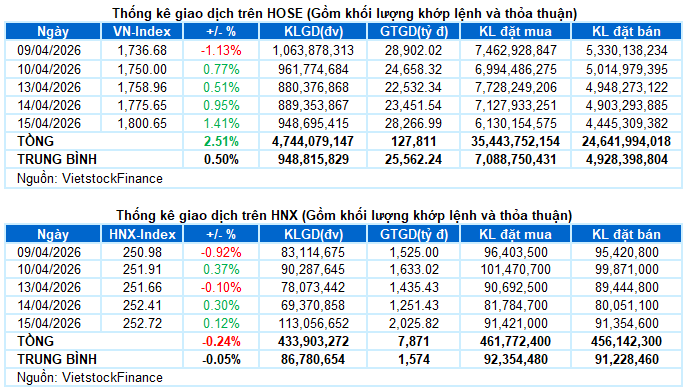 - Các chỉ số chính tiếp tục tăng điểm trong phiên giao dịch ngày 15/04. VN-Index tăng 1.41%, lên mức 1,800.65 điểm. HNX-Index nhích nhẹ 0.12%, đạt 252.72 điểm.