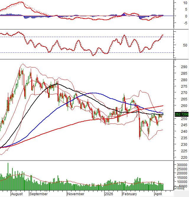 VN-Index nối dài đà tăng lên phiên thứ 4 liên tiếp và bám sát Upper Band của Bollinger Bands. Triển vọng tích cực được củng cố trong bối cảnh chỉ báo MACD tiếp tục nới rộng khoảng cách với đường Signal và đã vượt lên trên ngưỡng 0. Tuy nhiên, Stochastic Oscillator đang có dấu hiệu chững lại trong vùng quá mua nên rủi ro rung lắc có thể gia tăng nếu tín hiệu bán xuất hiện trong các phiên tới.