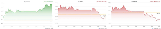 - Diễn biến các nhóm vốn hóa cho thấy sự lệch pha rõ rệt khi VS-LargeCap tăng mạnh 1.57%, đóng vai trò trụ đỡ chính cho chỉ số. Ngược lại, VS-MidCap và VS-SmallCap lần lượt giảm nhẹ 0.07% và 0.16%, phản ánh rõ nét trạng thái phân hóa và sự thiếu lan tỏa của dòng tiền trên thị trường.