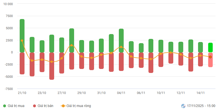 Biến động của dòng tiền từ khối ngoại: Khối ngoại tiếp tục bán ròng trong phiên giao dịch ngày 17/11/2025. Nếu nhà đầu tư nước ngoài duy trì hành động này trong những phiên tới thì tình trạng rung lắc có thể xuất hiện.
