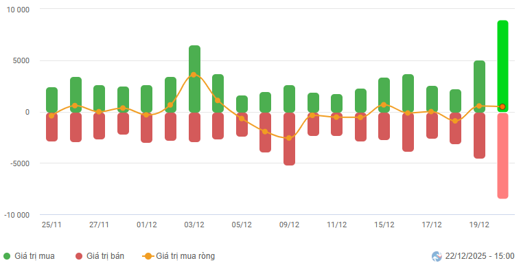 Biến động của dòng tiền từ khối ngoại: Khối ngoại mua ròng trong phiên giao dịch ngày 22/12/2025. Nếu nhà đầu tư nước ngoài duy trì hành động này trong những phiên tới thì đà tăng sẽ còn tiếp diễn.