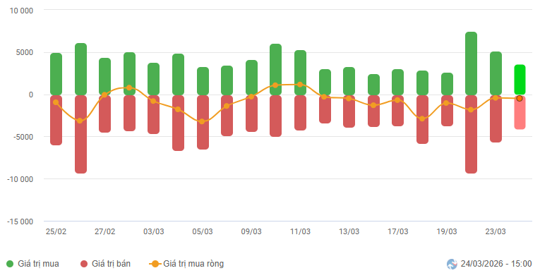 Biến động của dòng tiền từ khối ngoại: Khối ngoại bán ròng trong phiên giao dịch ngày 24/03/2026. Nếu nhà đầu tư nước ngoài duy trì hành động này trong những phiên tới thì thị trường sẽ còn gặp nhiều thách thức.