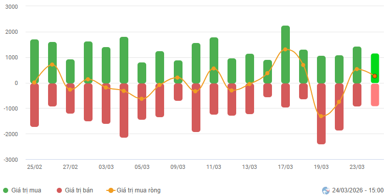 Biến động của dòng tiền từ khối ngoại: Khối ngoại bán ròng trong phiên giao dịch ngày 25/03/2026. Nếu nhà đầu tư nước ngoài duy trì hành động này trong những phiên tới thì thị trường có thể đối mặt với các nhịp rung lắc.