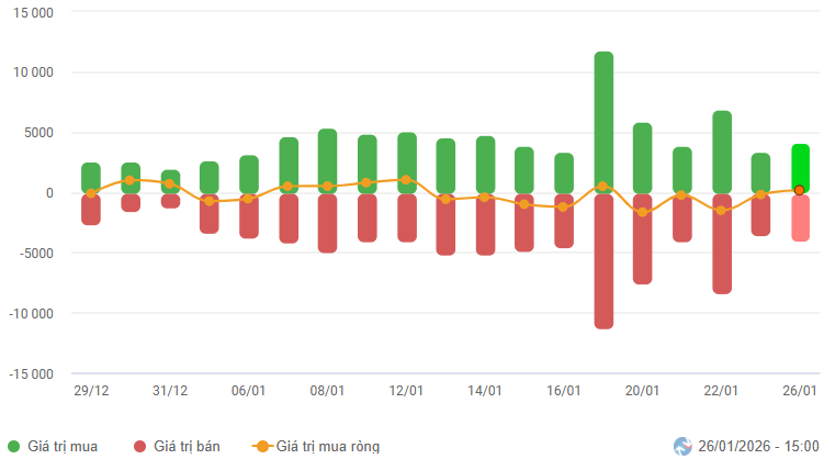 Biến động của dòng tiền từ khối ngoại: Khối ngoại mua ròng trong phiên giao dịch ngày 26/01/2026. Nếu nhà đầu tư nước ngoài duy trì hành động này trong những phiên tới thì tình hình sẽ bớt bi quan hơn.