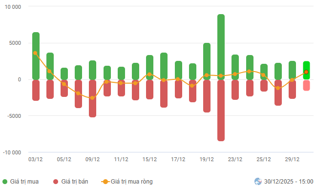 Biến động của dòng tiền từ khối ngoại: Khối ngoại quay lại mua ròng trong phiên giao dịch ngày 30/12/2025. Nếu nhà đầu tư nước ngoài duy trì hành động này trong những phiên tới thì tình hình sẽ càng lạc quan hơn.