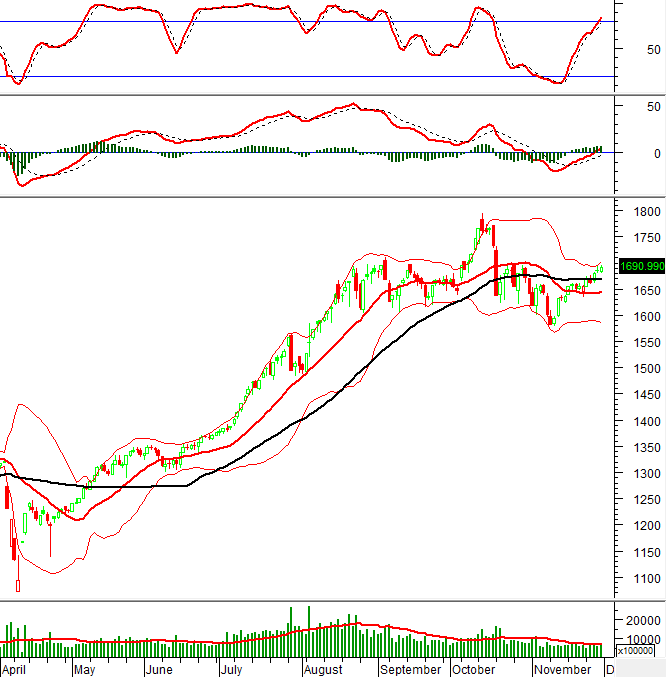 Hiện tại, chỉ báo Stochastic Oscillator tiếp tục tăng và đã tiến vào vùng quá mua (Overbought) sau khi cho tín hiệu mua. Nếu chỉ báo xuất hiện tín hiệu bán trở lại và rơi khỏi vùng này trong các phiên tới thì rủi ro sẽ tăng cao.