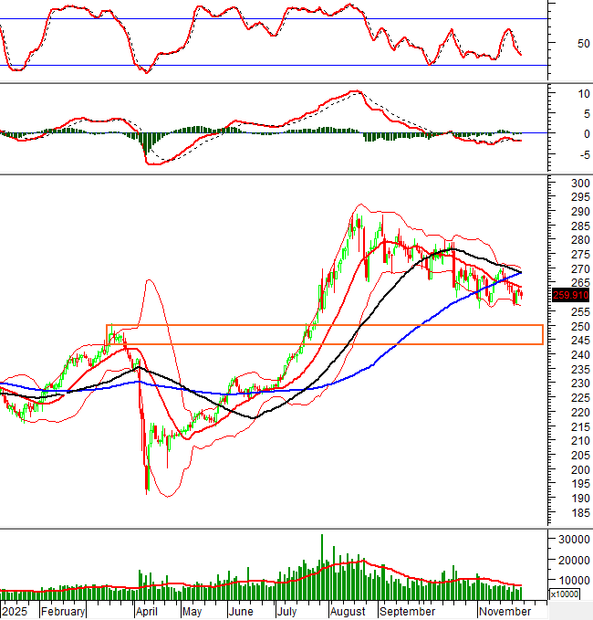 Thêm vào đó, nhóm đường SMA 50 ngày và SMA 100 ngày tiếp tục thu hẹp khoảng cách trong bối cảnh khối lượng giao dịch liên tục nằm dưới mức trung bình 20 phiên kể từ 05/11/2025 đến nay.