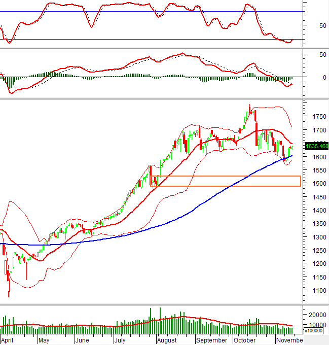 Trong khung thời gian tuần (10-14/11/2025), VN-Index hồi phục sau chuỗi 4 tuần điều chỉnh liên tiếp, cho thấy lực cầu bắt đáy hoạt động trở lại quanh vùng hỗ trợ 1,580-1,600 điểm. Tuy nhiên, đà phục hồi sẽ cần được củng cố bằng sự cải thiện rõ rệt của thanh khoản trong thời gian tới.
