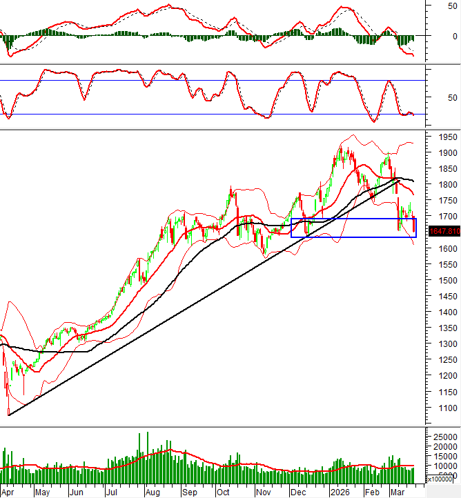 Trong khung thời gian tuần (16-20/03/2026), VN-Index giảm điểm tuần thứ 3 liên tiếp và đang test lại đáy cũ tháng 12/2025 (tương đương vùng 1,630-1,690). Rủi ro sẽ tăng cao nếu chỉ số không thể giữ được vùng hỗ trợ này trong thời gian tới.