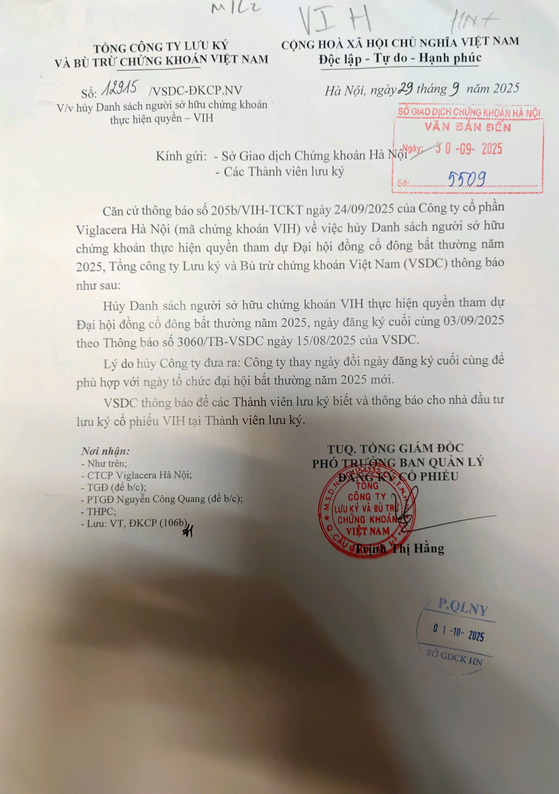 VIH: Thông báo của VSDC về việc hủy danh sách người sở hữu chứng khoán thực hiện quyền tham dự ĐHĐCĐ bất thường 2025