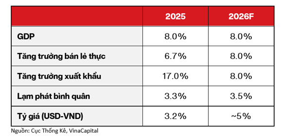 VinaCapital kỳ vọng 3 động lực then chốt sẽ thúc đẩy tăng trưởng GDP năm 2026 bao gồm: sự phục hồi tiêu dùng ở mức vừa phải, mối liên kết giữa tăng trưởng hạ tầng và bất động sản, và xuất khẩu sang Mỹ tiếp tục giữ được đà ổn định. Trong kịch bản tích cực, tăng trưởng GDP có thể đạt khoảng 10% trong năm 2026, trong bối cảnh Chính phủ vẫn còn nhiều công cụ trong tay để hỗ trợ tăng trưởng khi cần thiết.