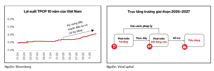 VinaCapital nhận thấy mối liên kết chặt chẽ giữa đầu tư hạ tầng thúc đẩy phát triển bất động sản, từ đó lan tỏa sang tiêu dùng. Giải ngân đầu tư công đã tăng mạnh, khoảng 40% trong năm 2025, dự báo tiếp tục tăng thêm 20-30% trong năm 2026. Bên cạnh đó, tốc độ tăng trưởng đầu tư công của Việt Nam được kỳ vọng tăng tốc từ mức tăng khoảng 10% mỗi năm trong 10 năm qua lên mức trung bình 20-30% mỗi năm trong thời gian tới, và kỳ vọng này đã góp phần đẩy lợi suất trái phiếu Chính phủ Việt Nam kỳ hạn 10 năm tăng khoảng 100 điểm cơ bản trong năm 2025, lên quanh mức 4%.