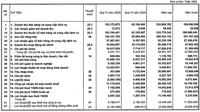 Doanh thu thuần hợp nhất năm 2025 của Tập đoàn VINGROUP - CTCP (HOSE: VIC) đạt 332.8 ngàn tỷ đồng, tăng 76% so với năm trước và là mốc doanh thu cao nhất lịch sử của Tập đoàn.