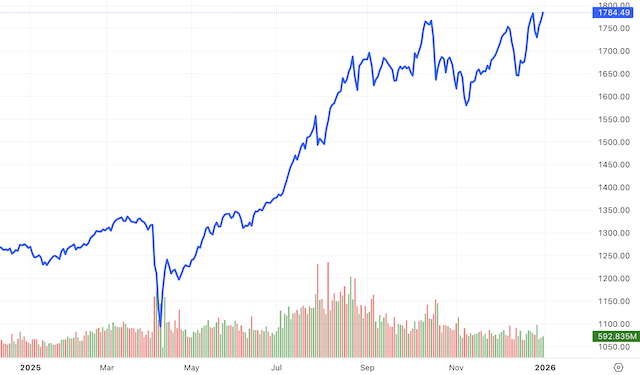 Ở Đông Nam Á, Việt Nam nổi bật với mức tăng gần 41% và là "á quân" tăng trưởng ở châu Á. Khép phiên cuối năm 2025, VN-Index dừng chân ở mức 1,784.49 điểm.