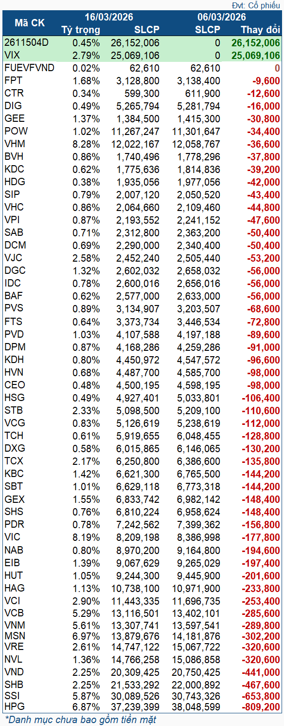 Thay đổi cổ phiếu quỹ VNM ETF trong giai đoạn 06-16/03