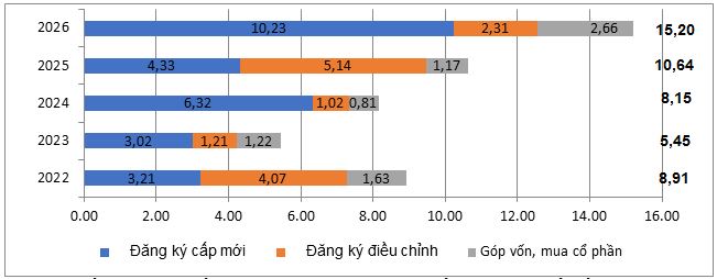 Cụ thể, tổng vốn đầu tư nước ngoài đăng ký vào Việt Nam tính đến ngày 31/3/2026 bao gồm: Vốn đăng ký cấp mới, vốn đăng ký điều chỉnh và giá trị góp vốn, mua cổ phần của nhà đầu tư nước ngoài đạt 15.20 tỷ USD, tăng 42.9% so với cùng kỳ năm trước.