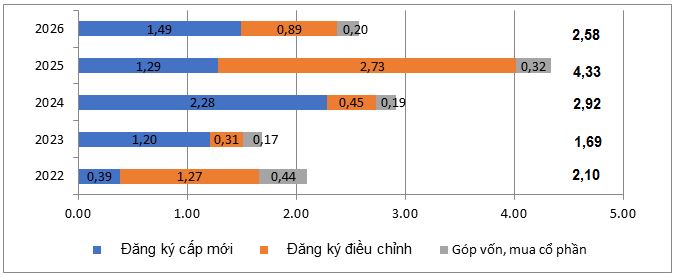 Cụ thể, tổng vốn đầu tư nước ngoài đăng ký vào Việt Nam tính đến ngày 31/01/2026 bao gồm: Vốn đăng ký cấp mới, vốn đăng ký điều chỉnh và giá trị góp vốn, mua cổ phần của nhà đầu tư nước ngoài đạt 2.58 tỷ USD, giảm 40.6% so với cùng kỳ năm trước.