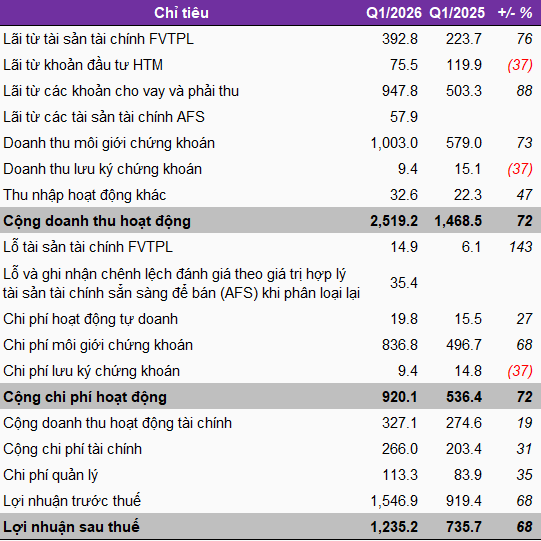 Quý 1/2026, VPS lãi trước thuế gần 1,547 tỷ đồng và lãi sau thuế hơn 1,235 tỷ đồng, tăng 68% so với cùng kỳ năm 2025. Kết quả này tương đương 27% mục tiêu lãi trước thuế 5,750 tỷ đồng dự kiến được HĐQT trình cổ đông xem xét tại ĐHĐCĐ thường niên sắp tới.