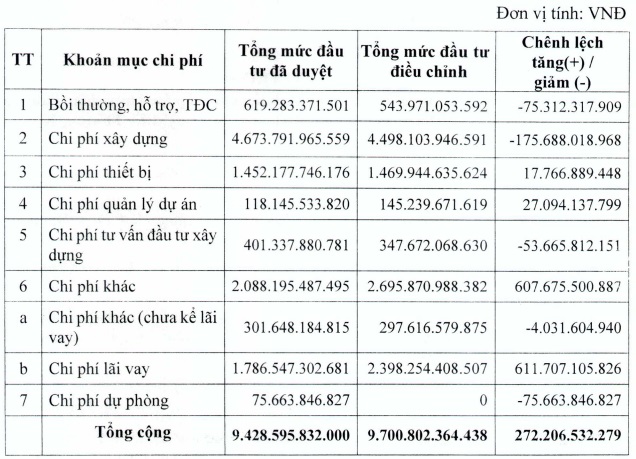 Theo tờ trình được thông qua, tổng mức đầu tư điều chỉnh lần cuối của dự án hơn 9.7 ngàn tỷ đồng, tăng hơn 272 tỷ đồng so với hơn 9.4 ngàn tỷ được ĐHĐCĐ 2019 phê duyệt.
