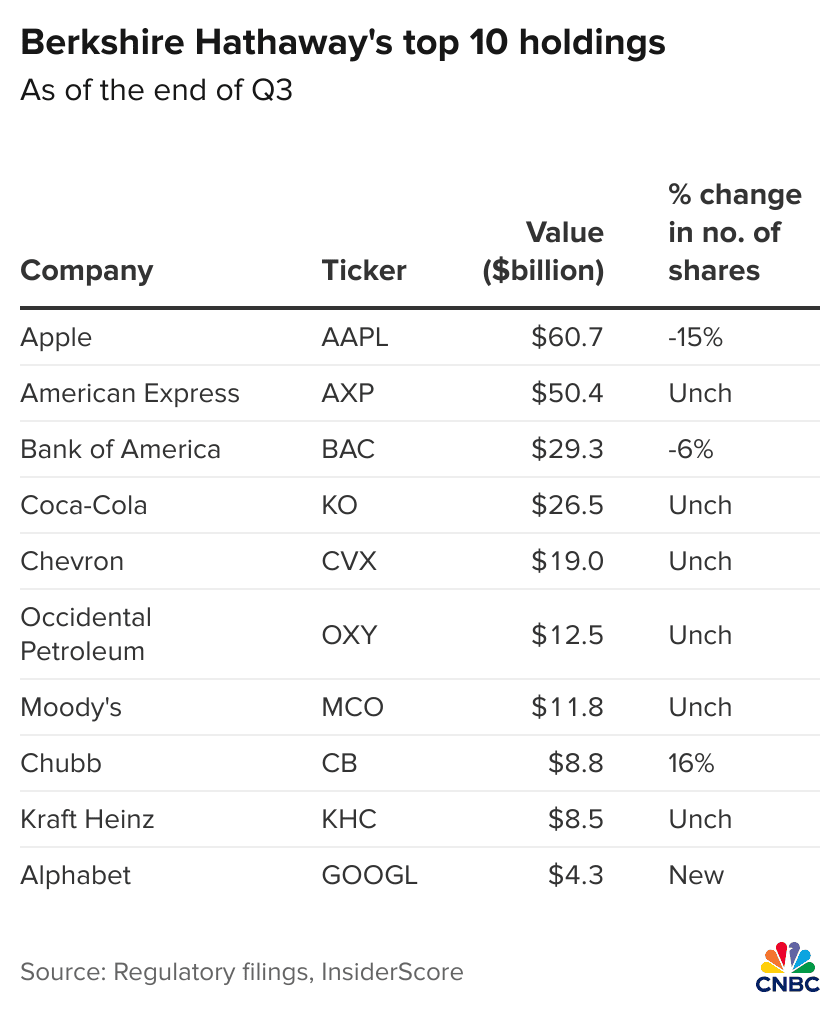 Berkshire Hathaway, dưới sự điều hành của Warren Buffett, hé lộ khoản đầu tư mới vào Alphabet, đưa công ty mẹ của Google trở thành khoản nắm giữ cổ phiếu lớn thứ 10 của tập đoàn vào cuối tháng 9, theo hồ sơ nộp cơ quan quản lý.