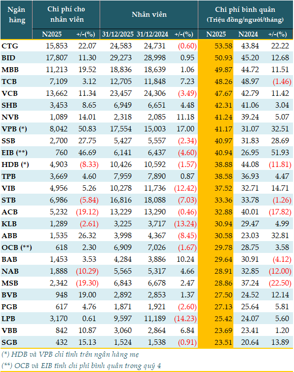 Chi phí ngân hàng chi cho nhân viên trong năm 2025 (Đvt: Tỷ đồng)