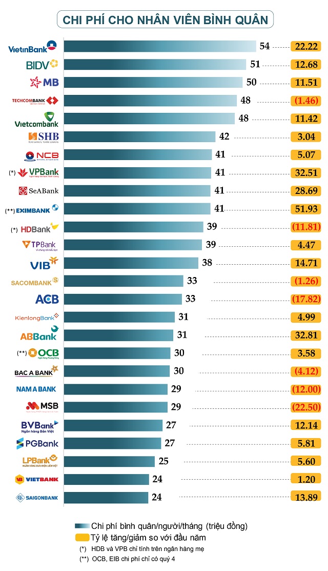 Nhiều năm, nhóm ngân hàng tư nhân giữ vị trí quán quân về mức chi bình quân cho nhân viên và nay đã nhường chỗ cho nhóm quốc doanh. VietinBank trở thành ngân hàng có mức thu nhập bình quân của nhân viên cao nhất với 53.58 triệu đồng/người/tháng (tăng hơn 22% so với năm trước). BIDV (BID) xếp thứ hai với 50.93 triệu đồng/người/tháng, tăng gần 13%. MB xếp vị trí thứ 3 với 49.87 triệu đồng/người/tháng, tăng gần 12%. Thứ tư là Techcombank (TCB) với 48.26 triệu đồng/người/tháng (-1.46%). Thứ năm là Vietcombank (VCB) với 47.67 triệu đồng/người/tháng, đã tăng hơn 11%.