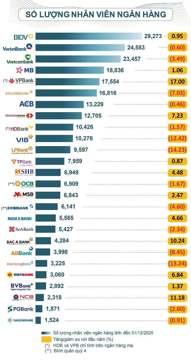 Tính đến cuối năm 2025, nhóm quốc doanh vẫn dẫn đầu về quy mô nhân sự; trong đó, dẫn đầu hệ thống là BIDV (29,272 người), VietinBank (CTG, 24,583 người) và Vietcombank (VCB, 23,457 người).