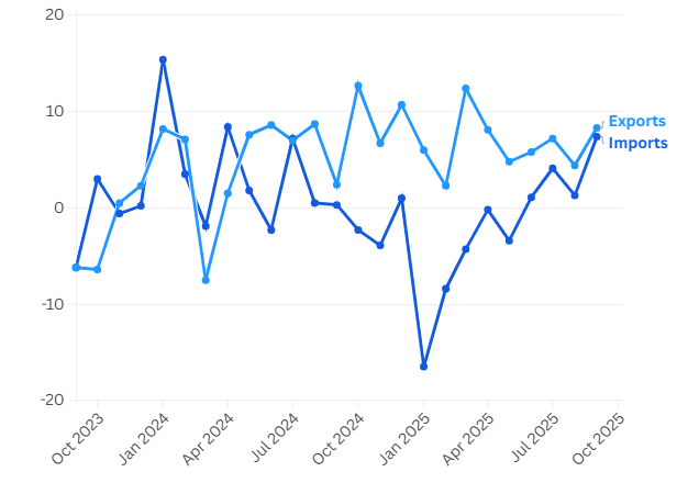 Kim ngạch nhập khẩu tháng 8 cũng đã tăng vọt 7.4% so với cùng kỳ, vượt xa mức dự báo tăng 1.5% của Reuters. Theo dữ liệu từ LSEG, đây là mức tăng trưởng mạnh nhất kể từ tháng 4/2024.