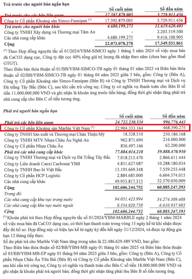 Ở giao dịch khác, Công ty có nghĩa vụ thanh toán cho CTCP Khoáng sản Marble Việt Nam 18 tỷ đồng, ghi nhận khoản phải trả người bán. Đồng thời, Công ty phải ghi nhận phải thu tương ứng với CTCP Nhựa Châu Âu Yên Bái.