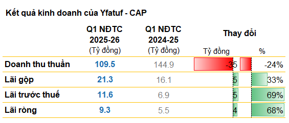Khép lại quý 1 niên độ tài chính 2025-2026, tương đương quý 4/2025 thực tế, Yfatuf ghi nhận lãi ròng 9.3 tỷ đồng, tăng 68% so với cùng kỳ niên độ trước. Tuy vậy, mức lợi nhuận này chủ yếu phản ánh sự phục hồi từ nền thấp, đồng thời cho thấy sự suy giảm rõ rệt so với quý liền trước.